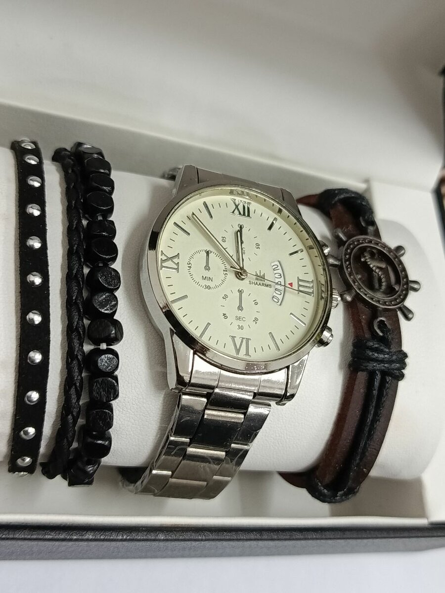 Élégante montre pour homme accompagnée de bracelets tendance. Parfait pour un look sophistiqué au quotidien. Idéale pour les occasions spéciales ou comme cadeau.
