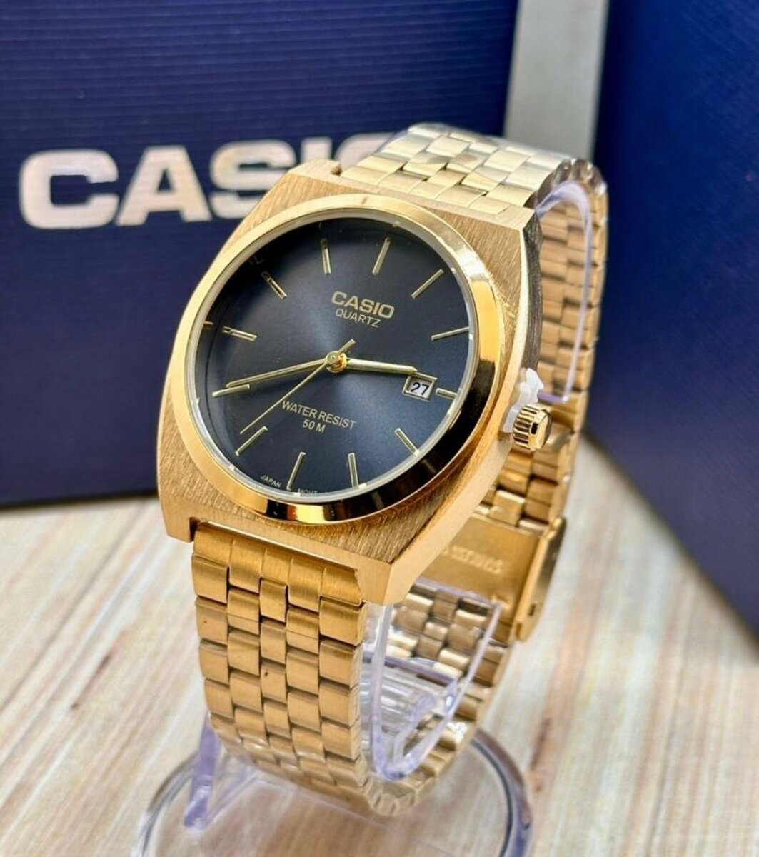 Découvrez cette montre Casio pour homme, élégante et moderne, dotée d'un bracelet et d'un boîtier en métal doré. Parfaite pour les occasions spéciales ou le quotidien.