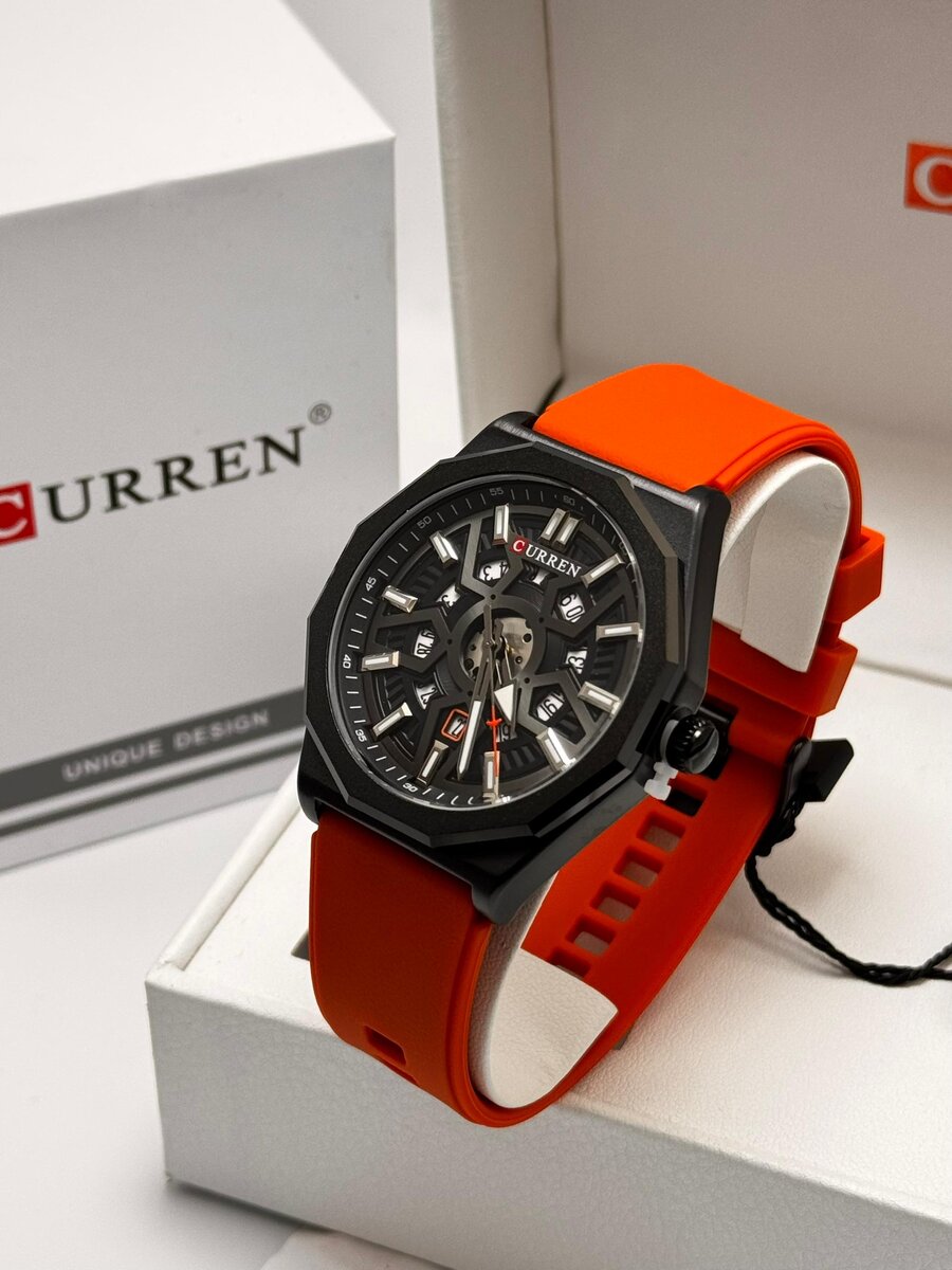 Découvrez l'élégance sportive avec la montre CURREN pour homme. Dotée d'un bracelet en silicone orange vibrant et d'un cadran noir moderne, elle est parfaite pour toute occasion. Résistante et stylée, elle rehaussera votre look au quotidien.