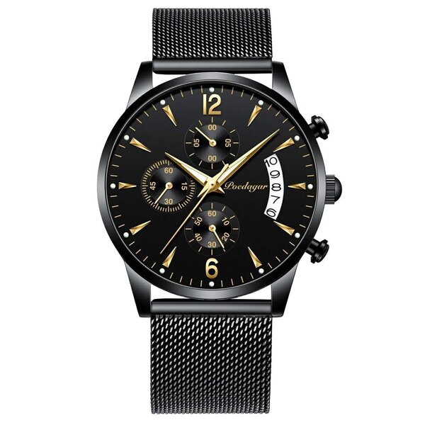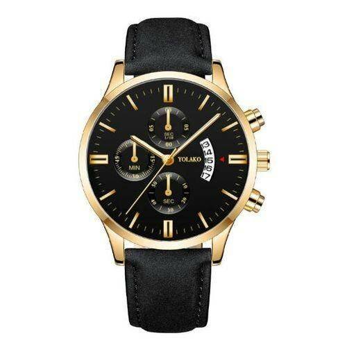 Élégante montre homme avec boîtier doré et bracelet en cuir noir. Parfait pour les occasions formelles ou quotidiennes. Design moderne avec affichage de la date et trois cadrans secondaires pour plus de fonctionnalité. Un choix idéal pour un look raffiné et sophistiqué.