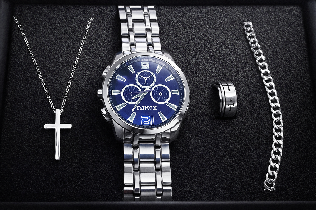 Montre Homme Luxe avec Bracelet et Collier Croix