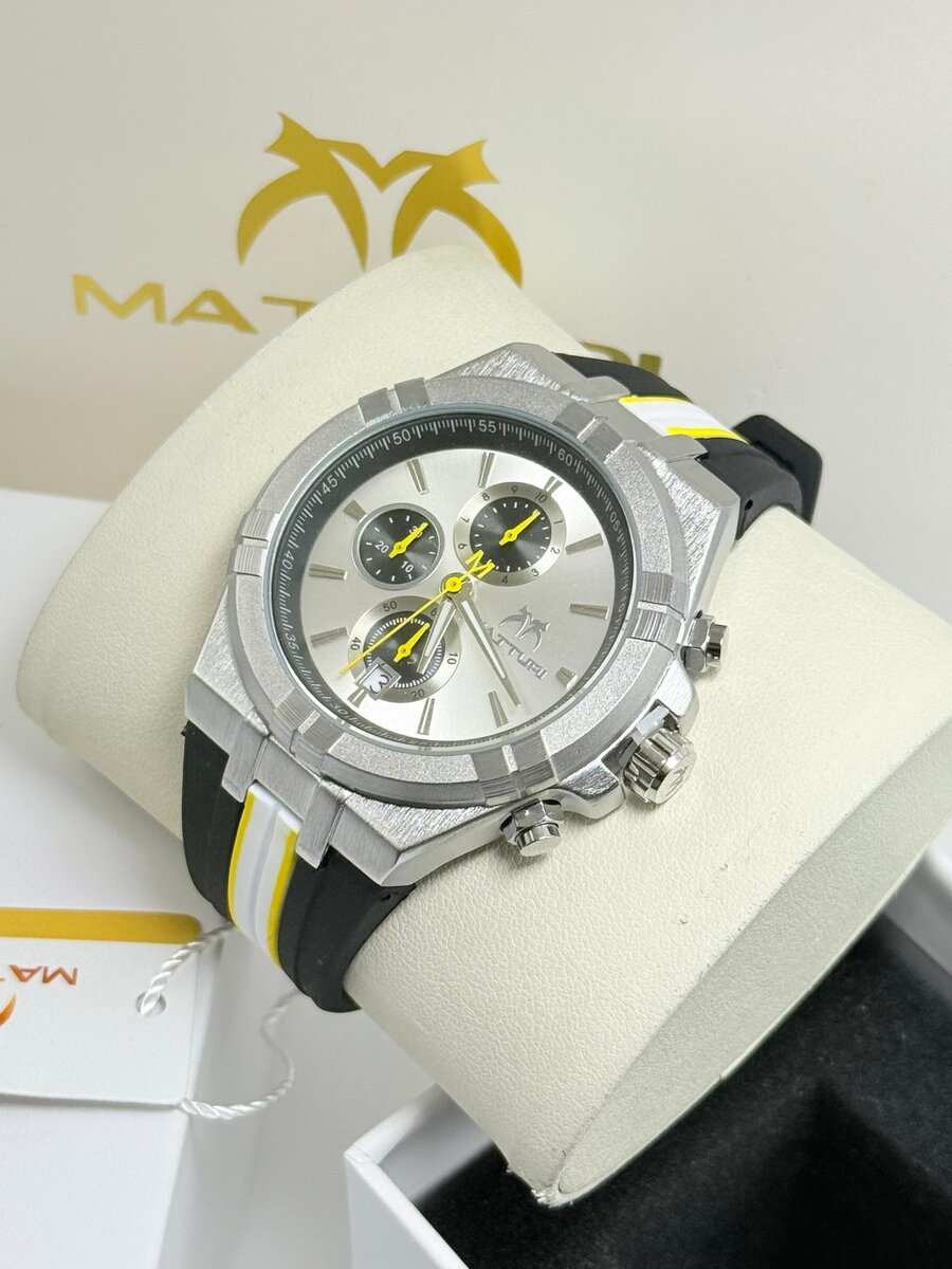 Découvrez la montre MATADOR pour homme, un accessoire élégant et robuste avec un design moderne. Bracelet noir et jaune, cadran argenté. Idéal pour les amateurs de style et de fonctionnalité.