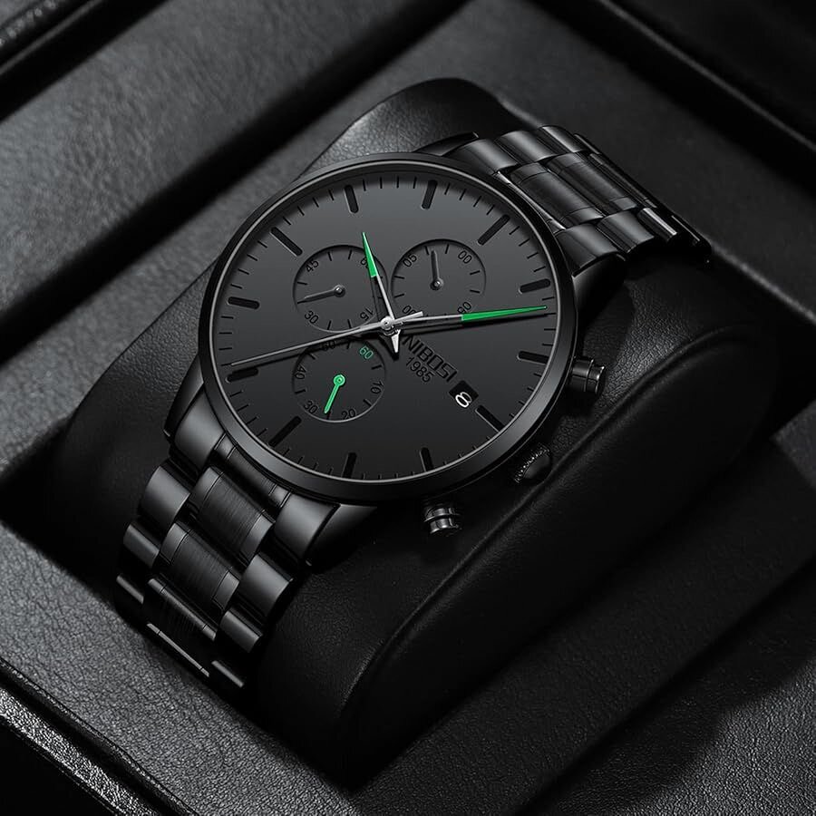 Découvrez cette montre masculine noire au design élégant et moderne. Parfaite pour les occasions formelles ou quotidiennes, elle offre un chronographe intégré et un bracelet en acier inoxydable, assurant durabilité et confort. Son cadran noir avec des détails verts ajoute une touche de sophistication. Idéale pour l'homme moderne cherchant à allier style et fonctionnalité.