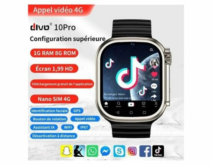 Découvrez la montre intelligente 4G avec écran 1,99 pouces, compatible Nano SIM, et fonctions GPS, assistant IA et appel vidéo. Étanche IP67, elle est idéale pour rester connecté partout. Parfaite pour les voyages et les activités quotidiennes.