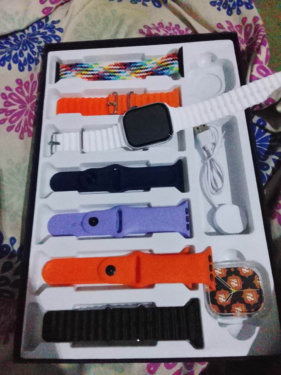 Ensemble de montre intelligente avec divers bracelets colorés. Comprend des options de personnalisation pour un style unique et un usage quotidien. Parfait pour rester connecté et élégant.