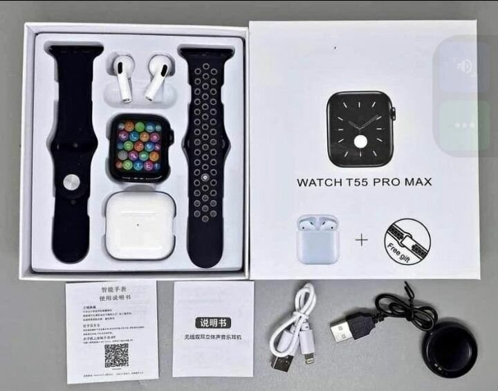 Découvrez la montre intelligente T55 Pro Max avec écouteurs sans fil inclus. Design élégant, multiples fonctionnalités de suivi de santé, et compatibilité universelle. Idéale pour le fitness, la gestion des notifications et la musique en déplacement. Améliorez votre quotidien avec cette montre tout-en-un.