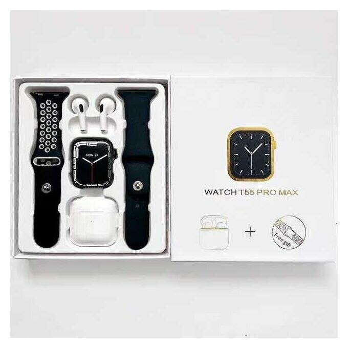 Découvrez la Montre intelligente T55 Pro Max, un ensemble élégant combinant technologie et style. Suivez vos activités avec précision tout en profitant d'un design moderne. Comprend deux bracelets interchangeables et écouteurs sans fil pour une expérience complète. Parfait pour les amateurs de gadgets et les sportifs en déplacement.