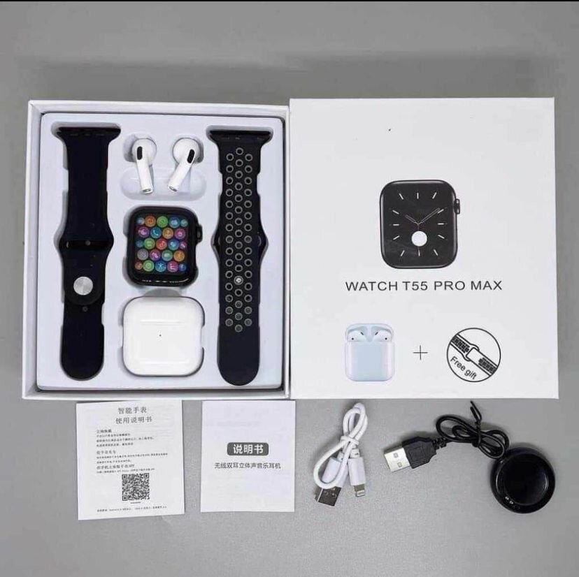 Découvrez la Montre Intelligente T55 Pro Max avec écouteurs sans fil et bracelet interchangeable. Parfaite pour le suivi de vos activités sportives et notifications en temps réel. Compatible avec iOS et Android, elle offre un design élégant et une autonomie longue durée. Idéale pour le quotidien et vos séances d'entraînement, elle est le choix parfait pour rester connecté facilement.
