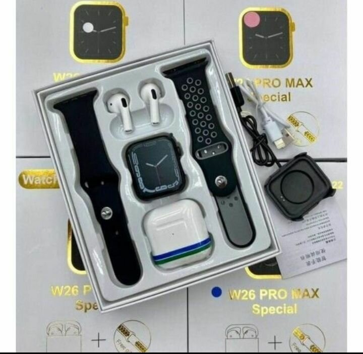 Découvrez la montre intelligente W26 Pro Max : design élégant, fonctionnalités avancées, parfait pour le suivi de santé et fitness. Inclus bracelets interchangeables, écouteurs et chargeur. Idéal pour rester connecté et actif toute la journée.