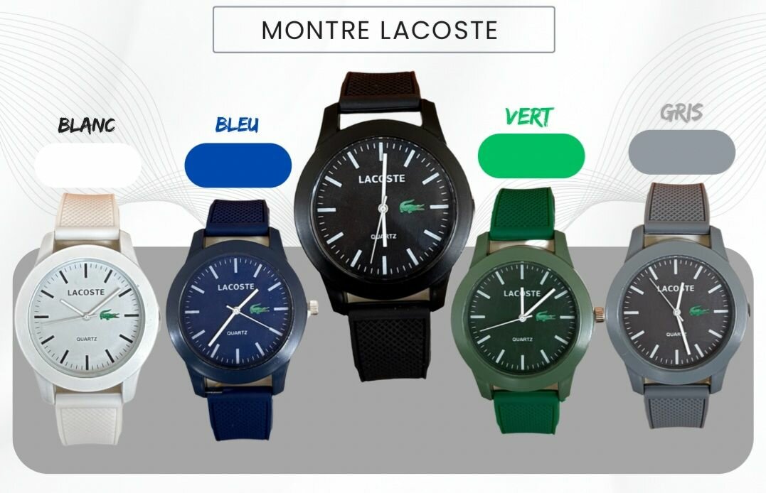 Découvrez l'élégance intemporelle de la Montre Lacoste. Disponible en plusieurs couleurs, elle est parfaite pour compléter votre style au quotidien. Avec son design moderne et son mécanisme fiable, cette montre est un choix idéal pour n'importe quelle occasion. Optez pour la qualité et le style avec Lacoste.