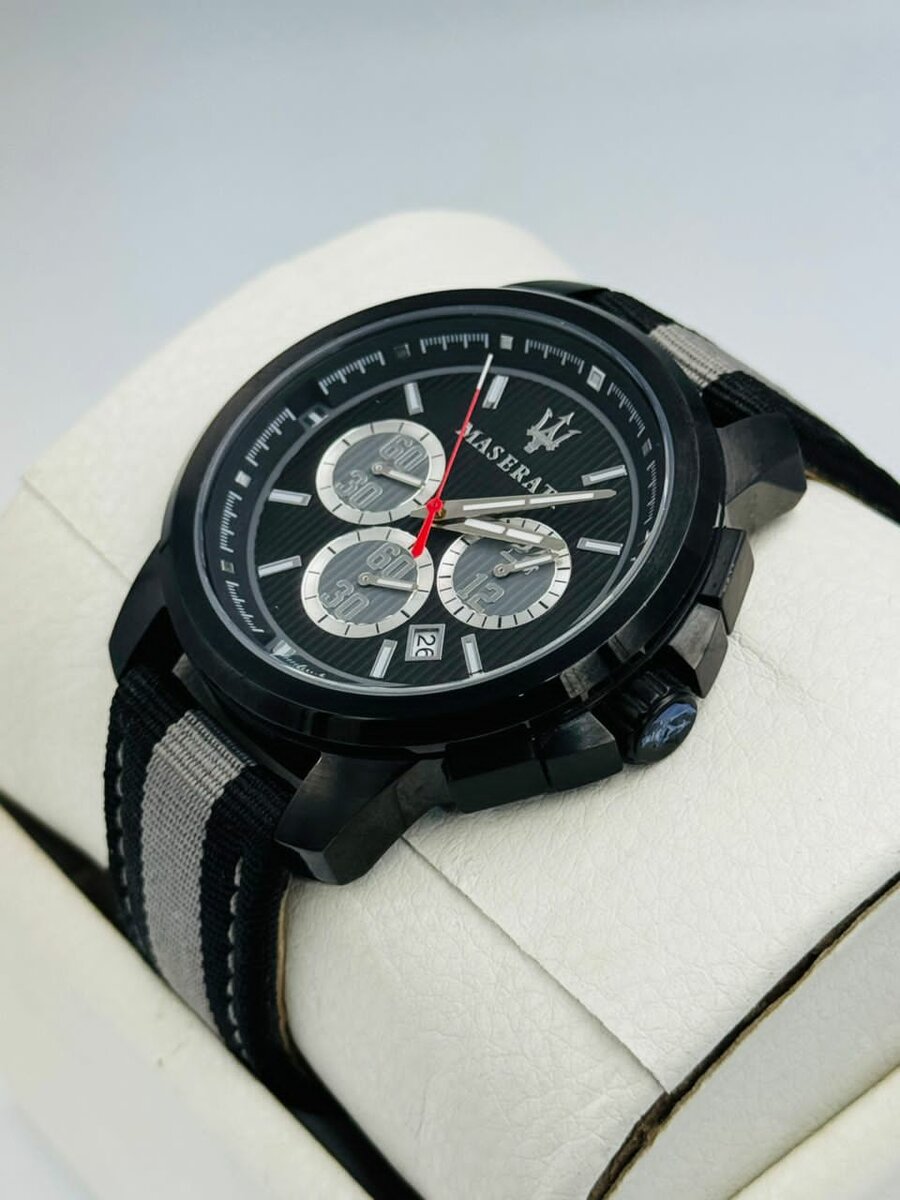 Élégante montre pour homme avec cadran noir et bracelet en tissu. Parfaite pour toutes les occasions, elle combine style et fonctionnalité. Un choix idéal pour une allure sophistiquée au quotidien.