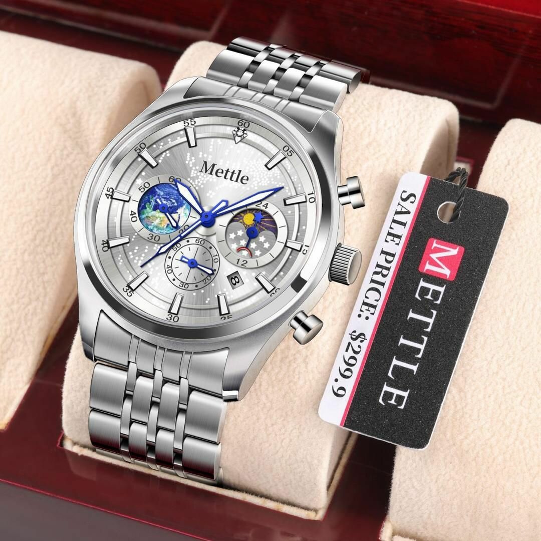 Élégante montre Mettle pour homme avec bracelet en acier inoxydable. Design sophistiqué avec fonction chronographe et marquage clair. Idéale pour un style chic au quotidien ou des occasions spéciales. Résistante et durable, elle est le choix parfait pour ceux qui apprécient style et fonctionnalité.