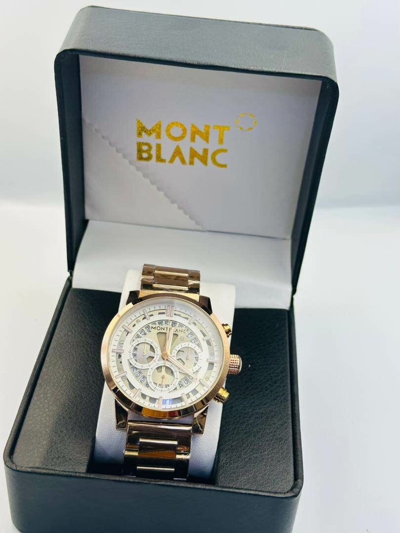 Découvrez la montre Montblanc pour homme, un chronographe élégant avec un design raffiné. Fabriquée avec des matériaux de haute qualité, cette montre est idéale pour les occasions spéciales ou pour tous les jours. Son cadran argenté et son boîtier doré ajoutent une touche de sophistication à votre style.