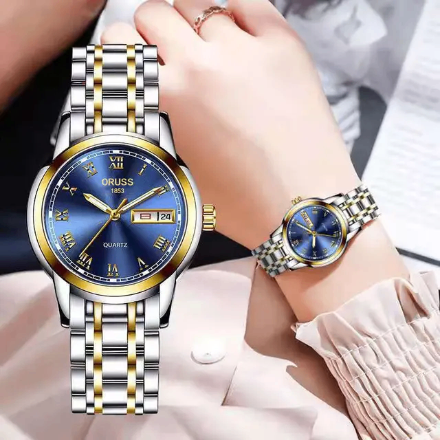 Montre Oruss muni d'un calandrier disponible en plusieurs couleurs. Prix 7500fr avec coffret. Conçue en acier inoxydable elle est étanche et ne noircit pas.
