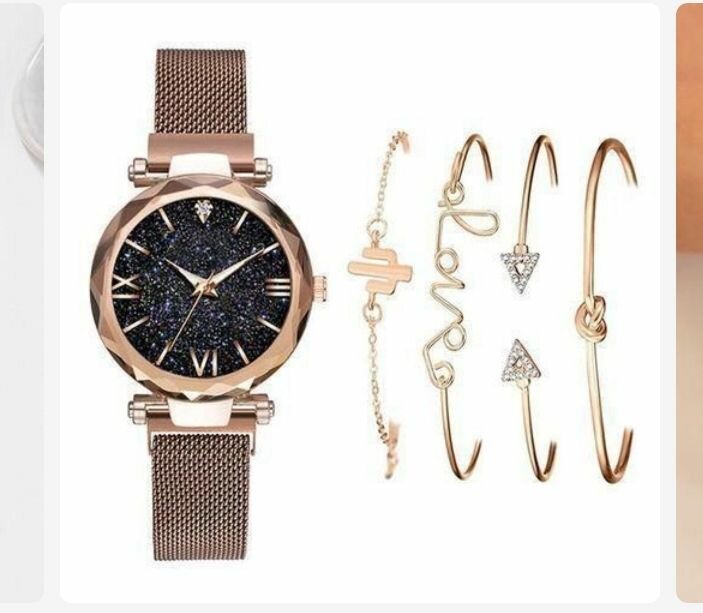 Élégant ensemble montre et bracelets en or rose pour femmes. Design chic avec cadran étincelant et bracelets variés, idéal pour une touche de glamour au quotidien. Parfait pour les occasions spéciales ou en cadeau.