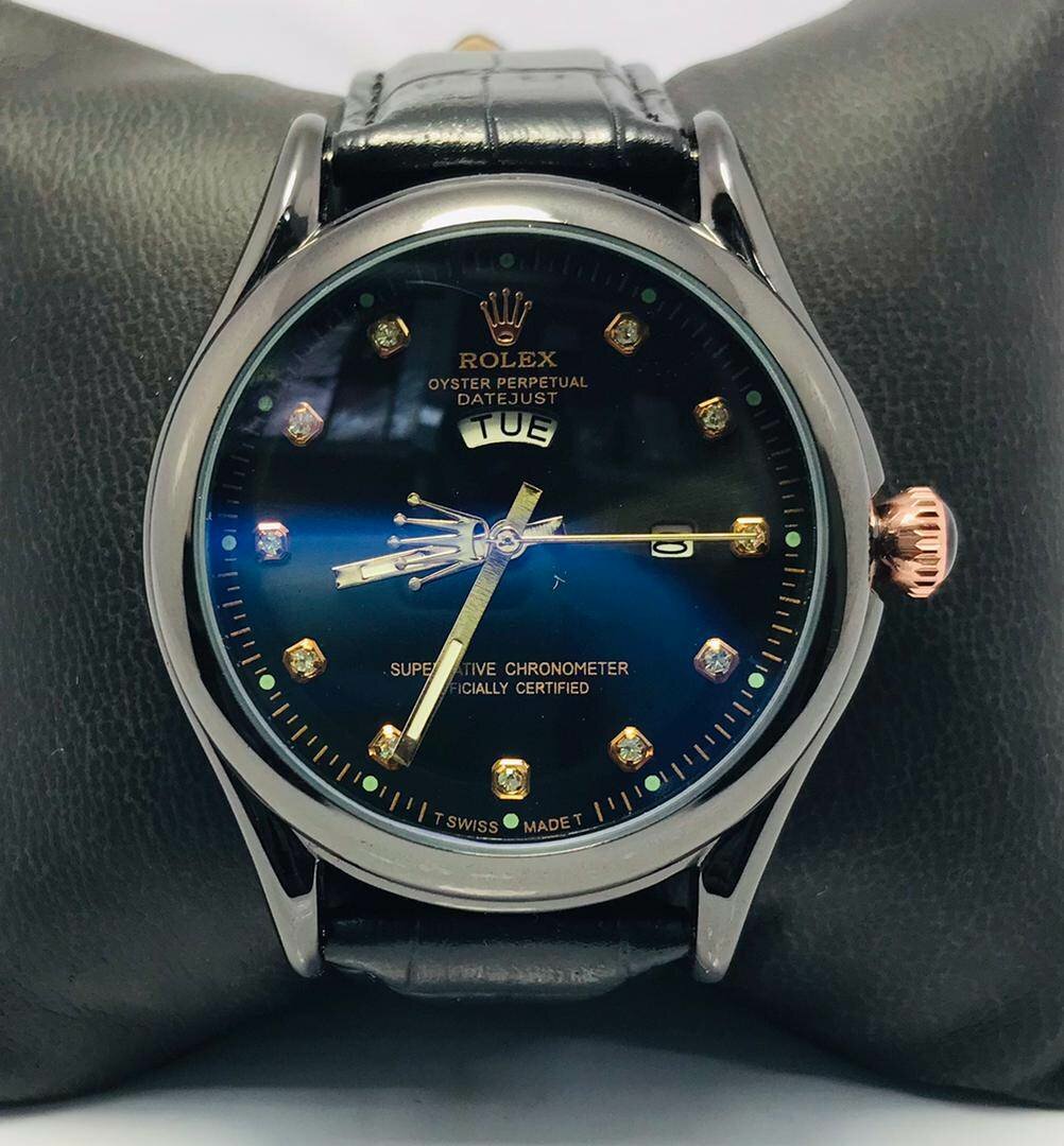 Montre rolex en cuir véritable de cadran argenté avec fond bleu