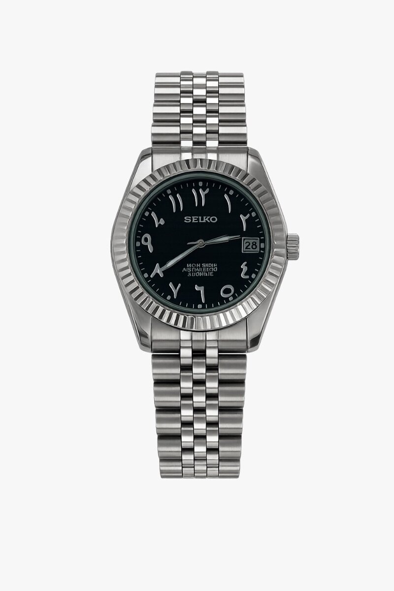 Sublime Seiko automatique avec cadran noir intense et chiffres arabes dorés.