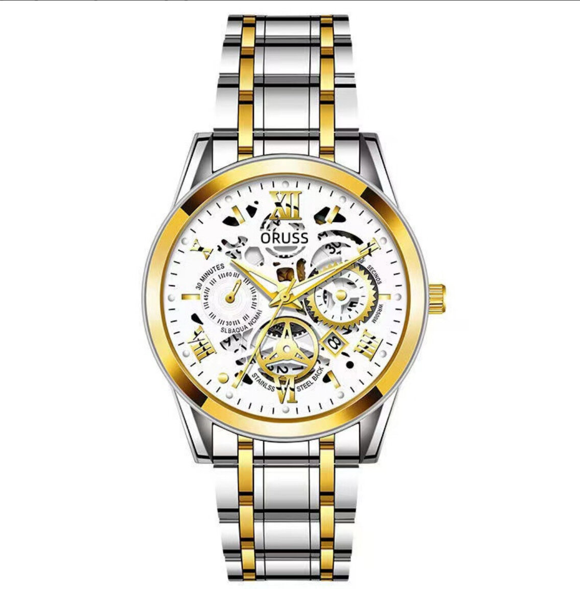 Découvrez cette montre squelette élégante, alliant acier inoxydable et détails dorés. Parfait pour les amateurs de sophistication et de mécanismes visibles. Idéale pour un usage quotidien ou des occasions spéciales.