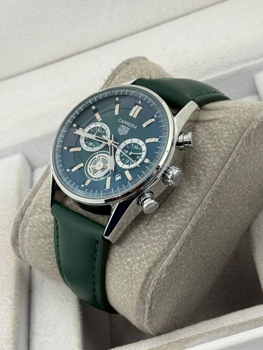 Découvrez la montre Tag Heuer Carrera pour homme, alliant élégance et performance. Avec son bracelet en cuir vert et son cadran bleu, ce modèle est parfait pour les amateurs de style et de précision.