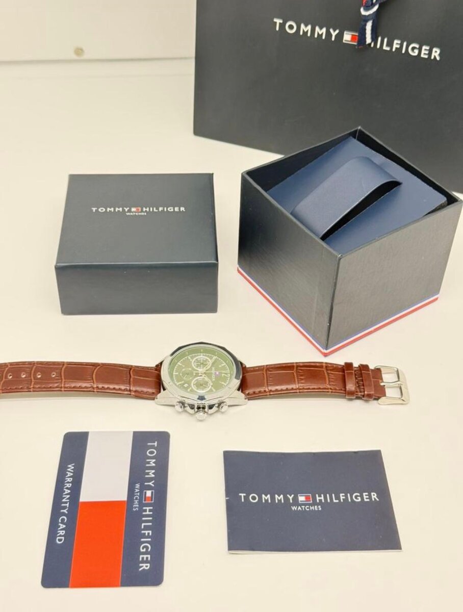 Découvrez cette montre élégante Tommy Hilfiger, dotée d'un bracelet en cuir marron et d'un cadran vert clair. Livrée dans son emballage d'origine avec carte de garantie. Un accessoire raffiné pour les hommes modernes.