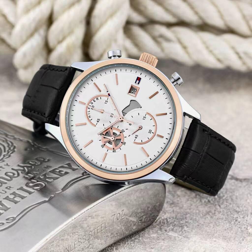 Cette Montre Tommy Hilfiger avec un boîtier en acier inoxydable et un bracelet en cuir. Le cadran de la montre est de couleur blanche avec un motif texturé. On y trouve trois sous-cadrans pour différentes fonctions. C'est un modèle chronographe, avec une échelle tachymétrique sur le bord extérieur du cadran. Dans l'ensemble, le design est sportif et moderne.