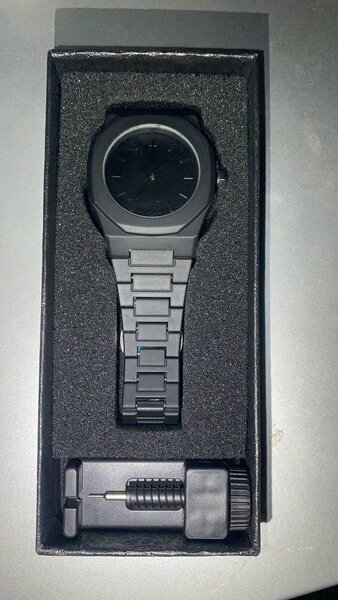 Montre-bracelet noire classique, design épuré et élégant, livrée neuve dans son coffret avec accessoire d’ajustement. Idéale en toute occasion.