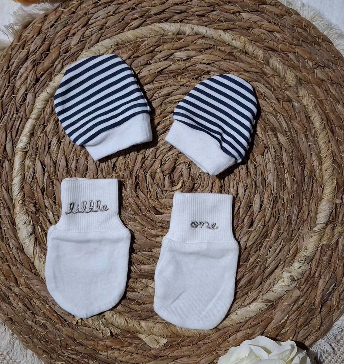 Ensemble de mouffles pour bébé, confortables et douces, avec des motifs 'little' et 'one'.