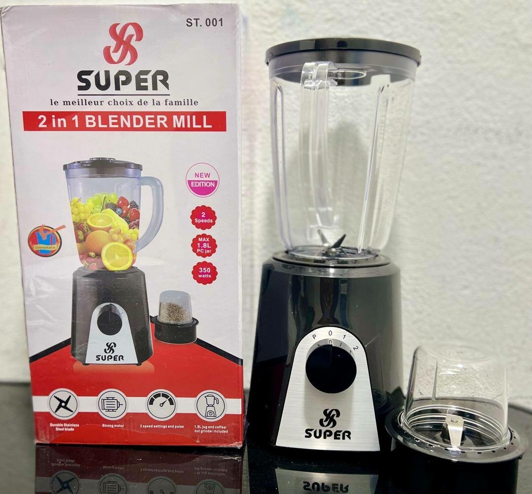 Optimisez votre cuisine avec le blender 2 en 1 Super. Idéal pour smoothies et purées, avec moulin intégré pour épices. Design moderne et puissant de 350W. Parfait pour toute recette maison!