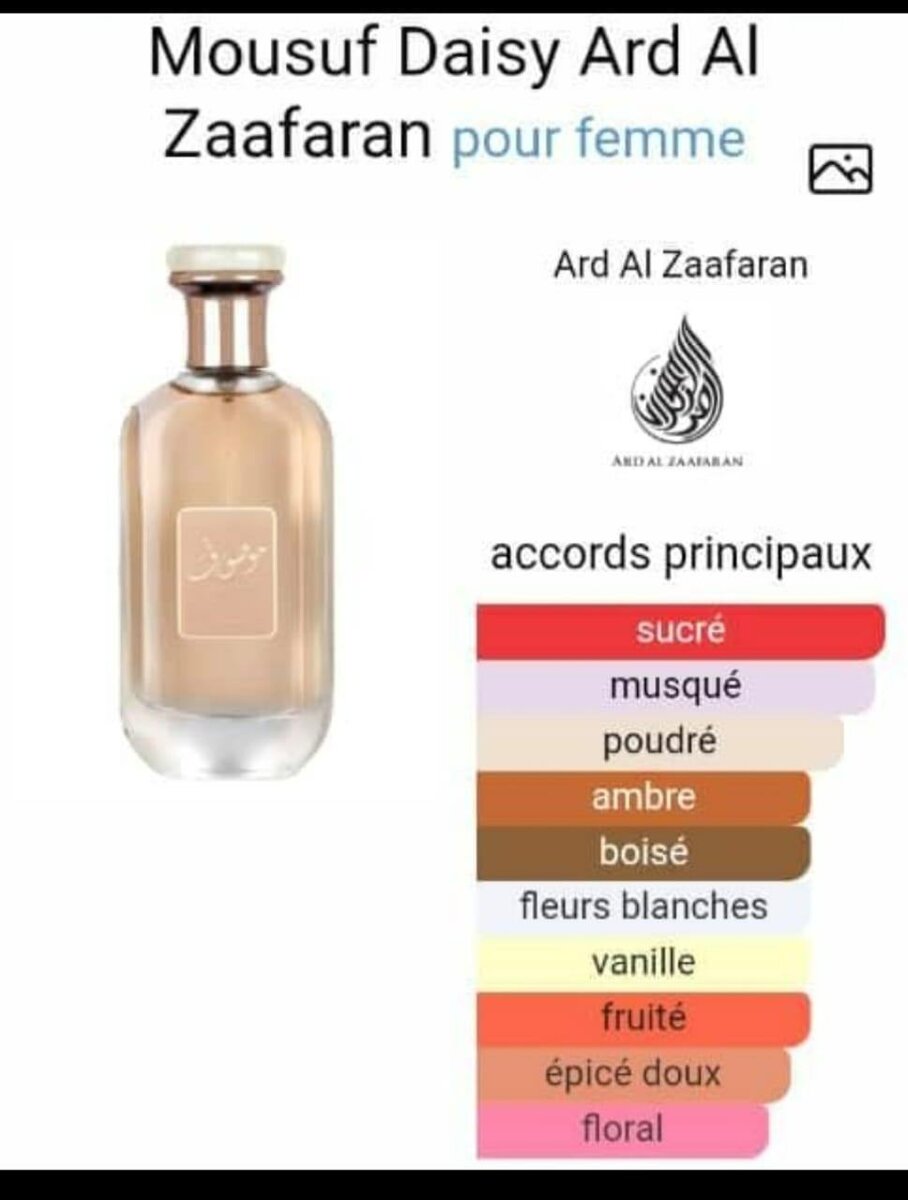 Mousuf Daisy de Ard Al Zaafaran 100ml est un parfum Floral pour femme. Les notes de tête sont Poivre rose et Myrtille; les notes de coeur sont Jasmin et Pâquerette; les notes de fond sont Vanille, Cèdre, Ambre et Musc.