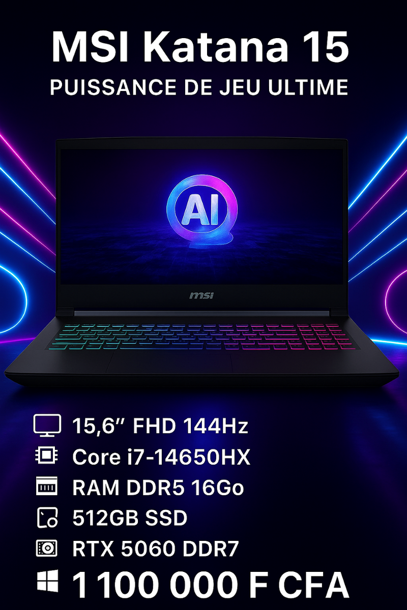 Le MSI Katana 15 est l'outil ultime pour les gamers et les créateurs. Avec un écran 15,6” FHD 144Hz, processeur Core i7-14650HX et carte graphique RTX 5060 DDR7, il offre une expérience de jeu fluide. Profitez de la vitesse avec 16Go RAM et 512GB SSD. Idéal pour jouer et créer sans limites.