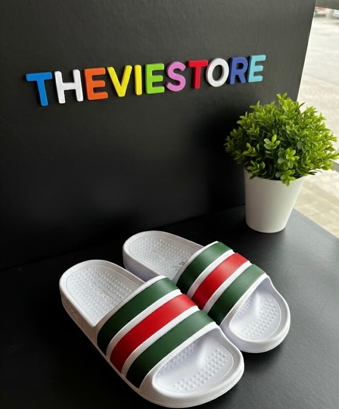 Mules confortables avec bandes vertes et rouges. Conçues pour un usage quotidien, ces mules sont parfaites pour la maison ou la plage. Résistantes et faciles à nettoyer.