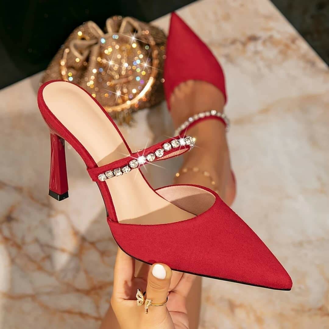 Craquez pour ces mules à talon rouge élégant avec bride ornée de strass, parfaites pour une touche glamour en sortie soirée. Confort et style garantis!