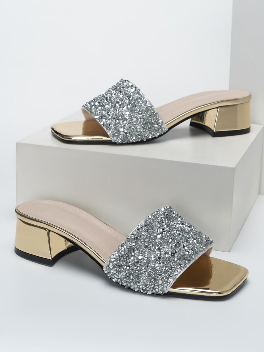 Ajoutez une touche d'éclat à votre tenue avec ces mules à talons dorés et pailletés. Parfaites pour une soirée ou une occasion spéciale, elles allient confort et style. Le talon bas assure une démarche élégante tout en restant confortable toute la nuit. Idéal pour un look glamour.