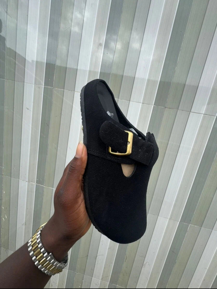 Découvrez ces mules noires en daim pour homme, conçues pour un confort optimal. Avec leur semelle plate et leur boucle dorée, elles sont parfaites pour une tenue décontractée ou élégante. Disponibles pour les hommes.