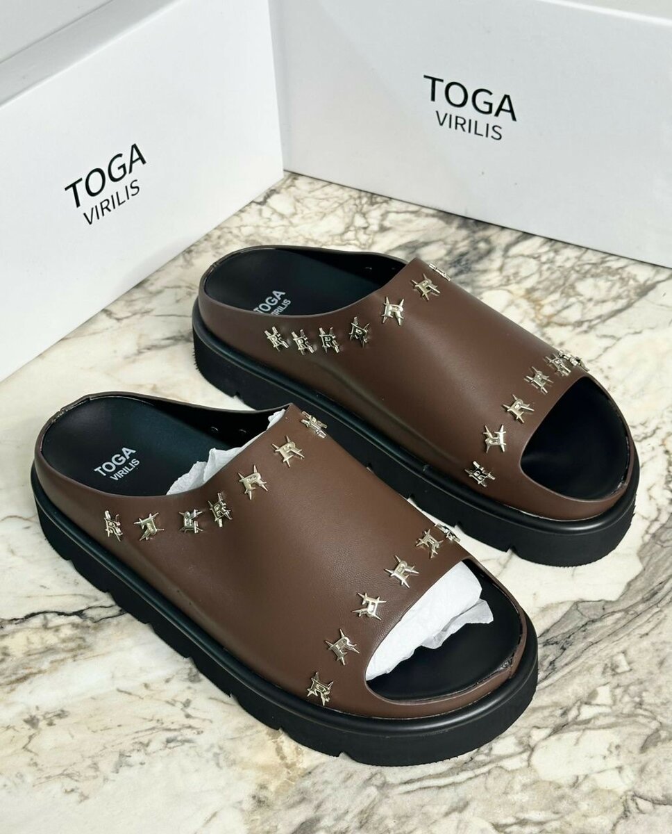 Découvrez les mules Toga Virilis en cuir, parfaites pour un confort tout en style. Avec des ornements distinctifs et une semelle solide, elles sont idéales pour toutes les occasions décontractées. Un choix parfait pour un look moderne et audacieux.