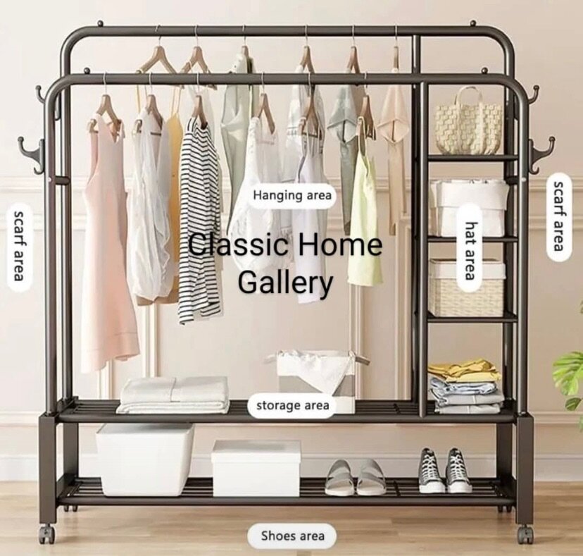 A double row high capacity hanger with shelves . Very strong, durable and it saves space.