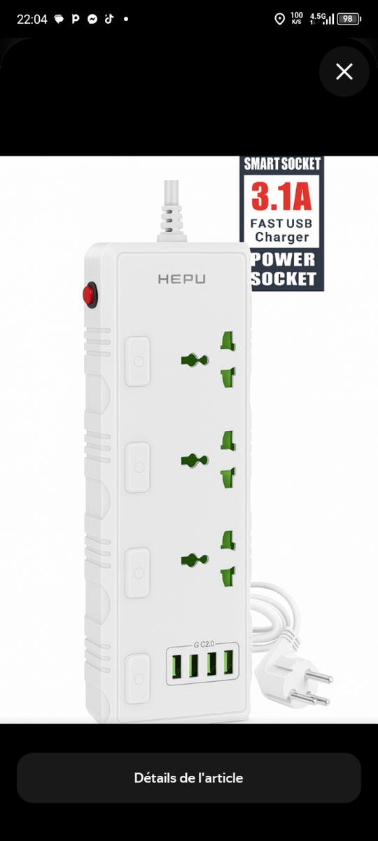 Profitez de cette multiprise innovante avec 3 ports USB de charge rapide 3.1A. Idéale pour la maison ou le bureau, elle permet de connecter plusieurs appareils simultanément. Son design compact et moderne en fait un choix parfait pour optimiser votre espace et améliorer votre confort au quotidien.