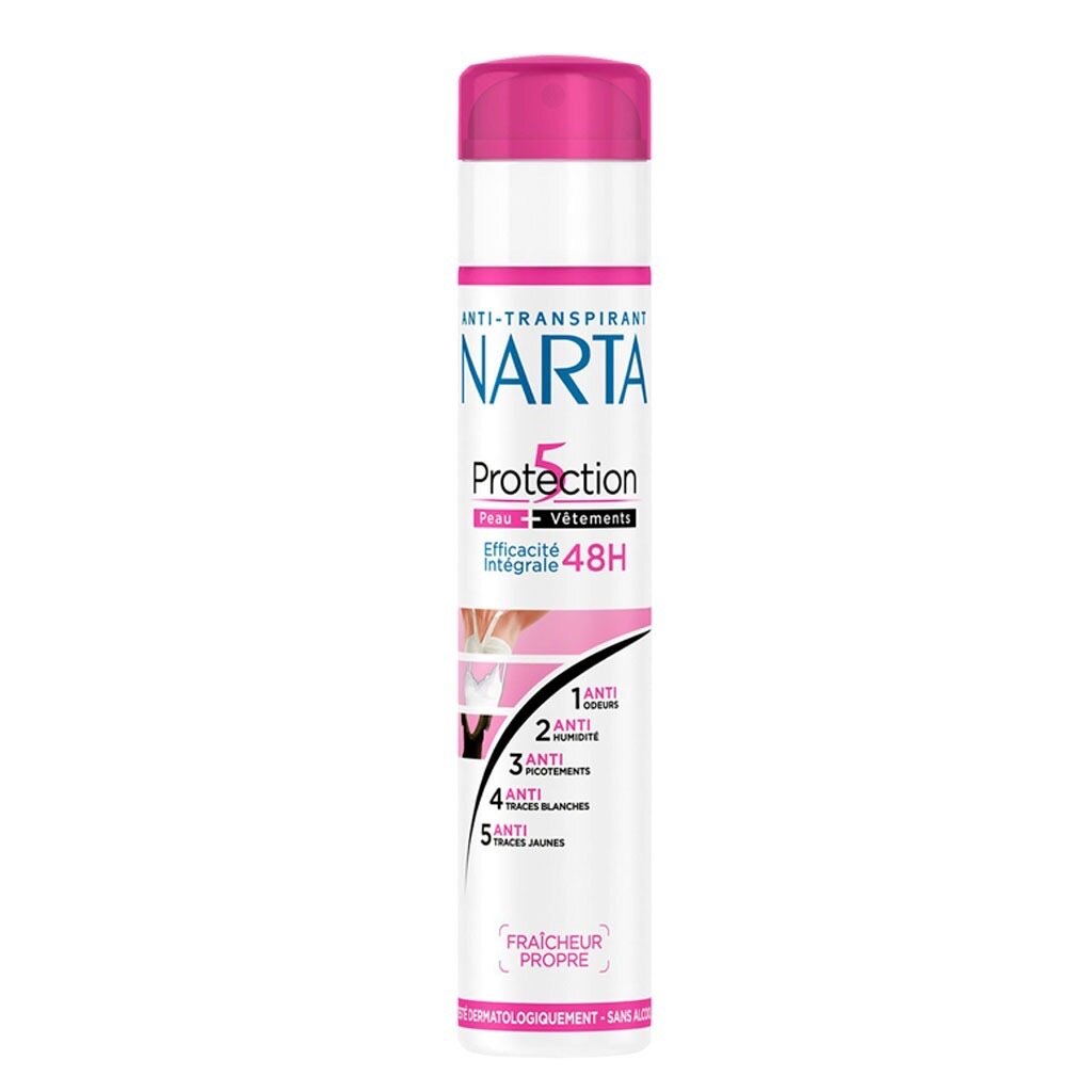 Lanti-transpirant Narta Protection 5 offre une efficacité 48h en 5 actions pour protéger votre peau et vos vêtements :