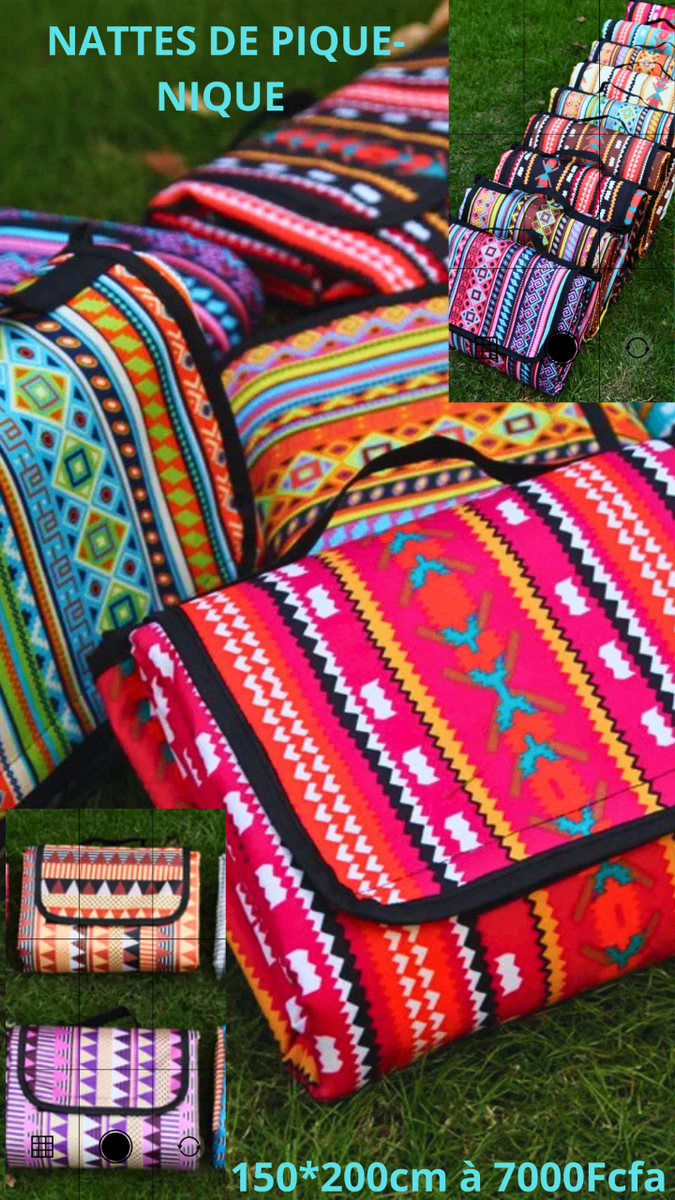 Nattes avec de beaux imprimés disponibles pour toutes vos activités dextérieur telles que: Pique-nique, Plage, Yoga, Elles sont: Imperméables Pliables Facile à transporter Donc parfaites pour toutes vos activités! 150*200cm à 7000Fcfa