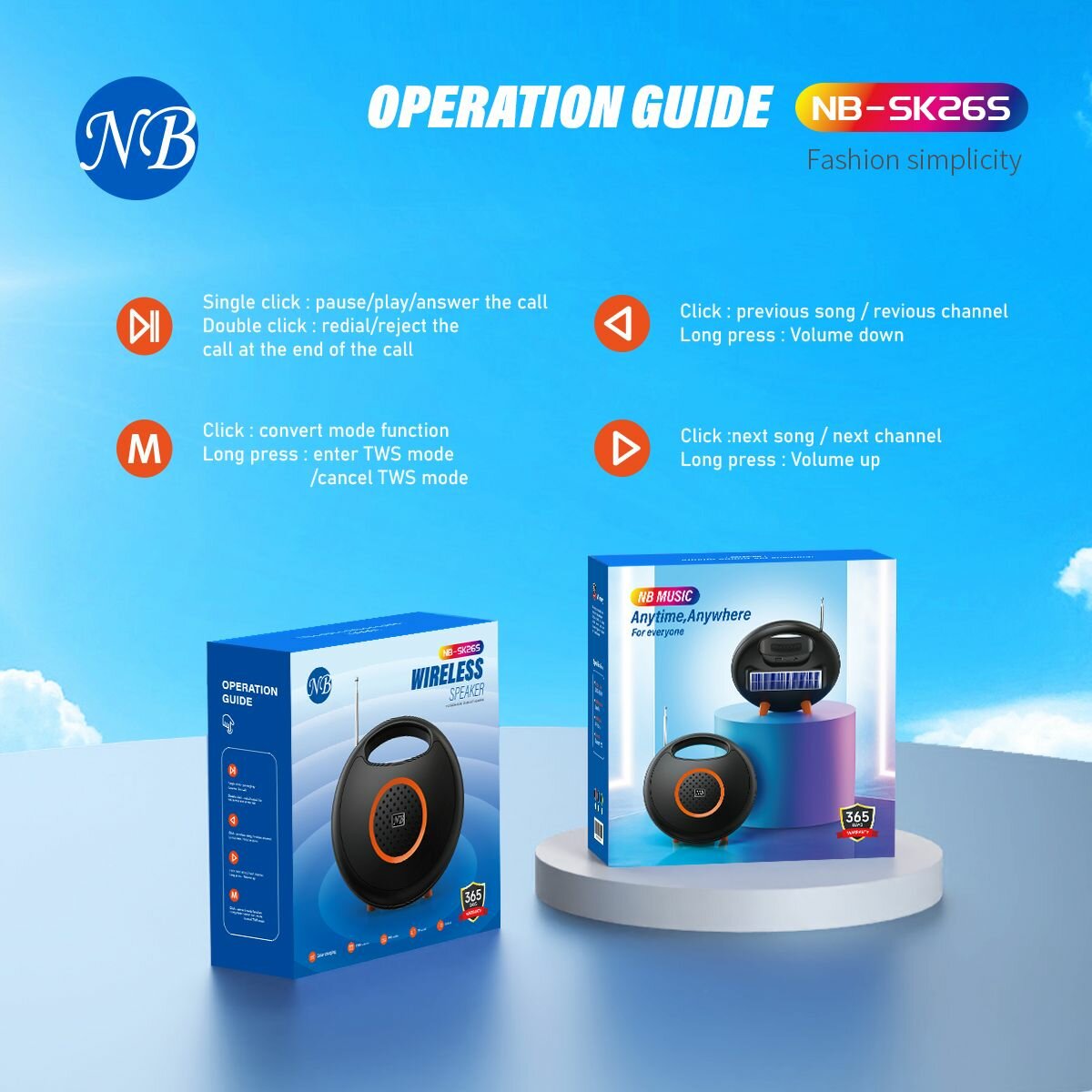 Découvrez l'enceinte portable NB SK265, alliant design moderne et énergie solaire. Connectivité Bluetooth pratique, parfait pour vos sorties en plein air. Choisissez parmi trois couleurs éclatantes : bleu, vert, et orange. Profitez d'une simplicité et d'une excellente qualité sonore avec une garantie de 365 jours. Idéale pour les mélomanes en déplacement!