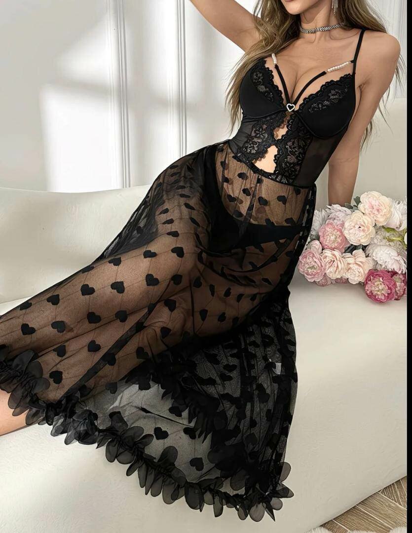 Découvrez ce magnifique négligé noir en dentelle transparente. Parfait pour des moments intimes, il allie élégance et sensualité. Sa coupe fluide et son tissu ajouré vous feront ressentir irrésistible.