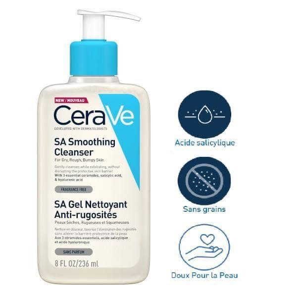 Découvrez le nettoyant lissant CeraVe SA, enrichi en acide salicylique pour une peau douce et lisse sans rugosité. Idéal pour les peaux sèches.