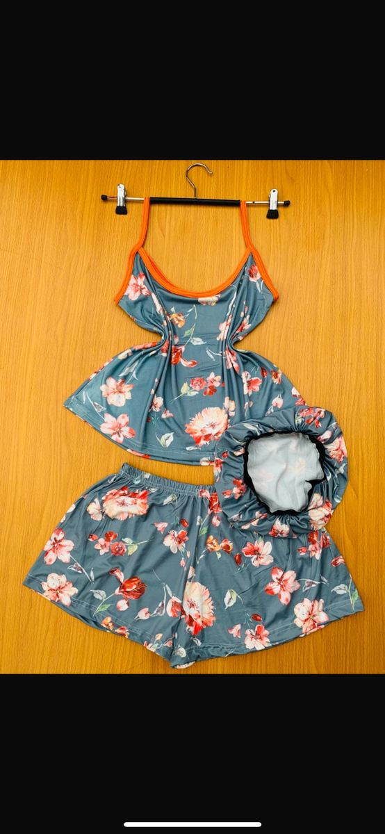 3 in 1 nightee containing a sleeveless top, shorts and a bonnet.