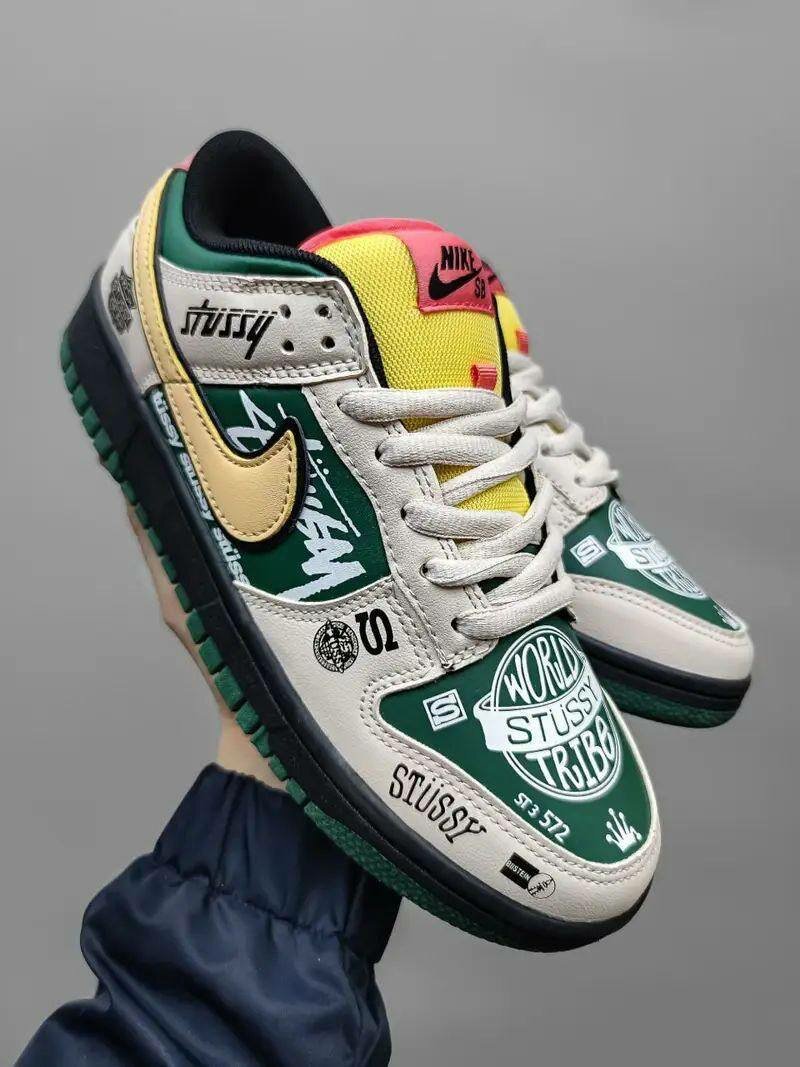 Chaussures Nike SB Dunk Low Stussy, modèle vert pour hommes, avec semelle en caoutchouc durable et lacets blancs, idéales pour la streetwear et les activités quotidiennes