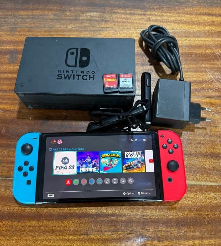 Découvrez la Nintendo Switch avec ses Joy-Con rouges et bleus, idéale pour le jeu à domicile ou en déplacement. Livré avec deux jeux populaires, un chargeur et une station d'accueil. Profitez d'une expérience vidéoludique immersive avec des titres comme FIFA et Fortnite. Parfait pour les amateurs de jeux de tous âges.