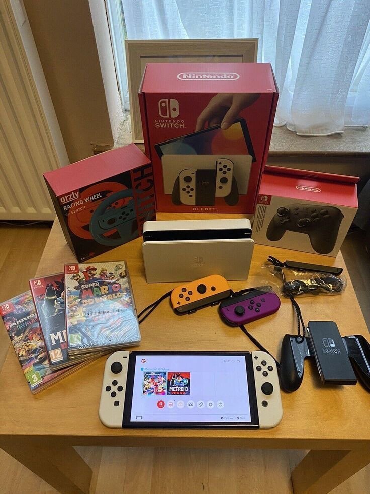 Nintendo Switch OLED avec accessoires complets. État neuf, jamais utilisé. Comprend la console, les Joy-Con, le dock, les chargeurs et les boîtes d'origine.
