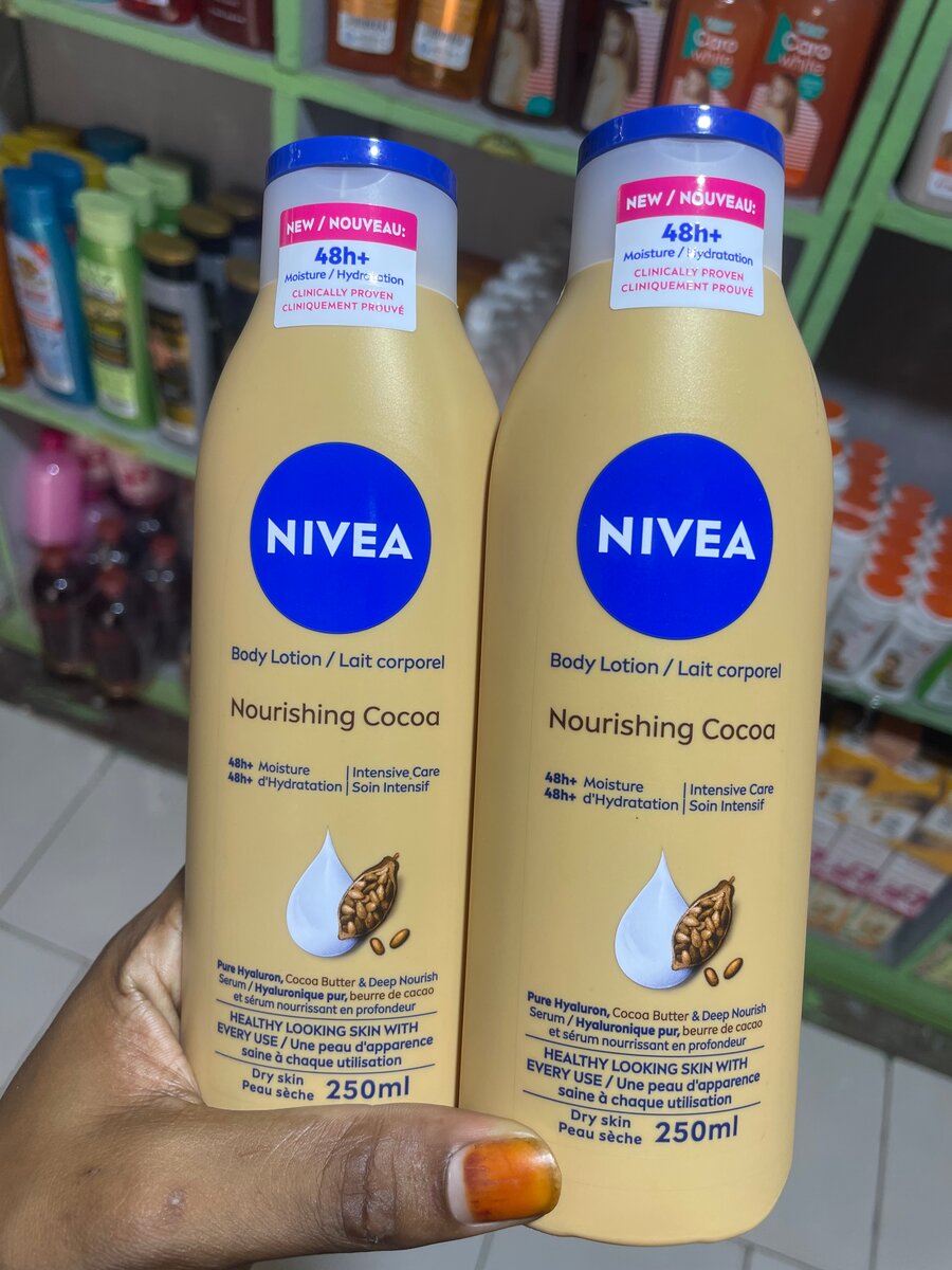 Découvrez le lait corporel NIVEA Nourishing Cocoa, enrichi en beurre de cacao pour une hydratation intense de 48h. Idéal pour une peau douce et nourrie. Format: 250ml.