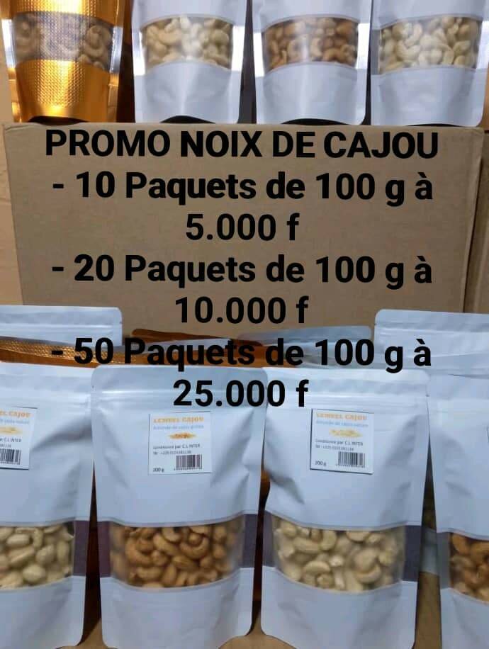 Profitez de notre promo spéciale sur les noix de cajou : 10 paquets de 100g pour seulement 5.000 f! Délicieuses et croquantes, idéales pour les collations de tous les jours. Ne ratez pas cette offre incroyable!