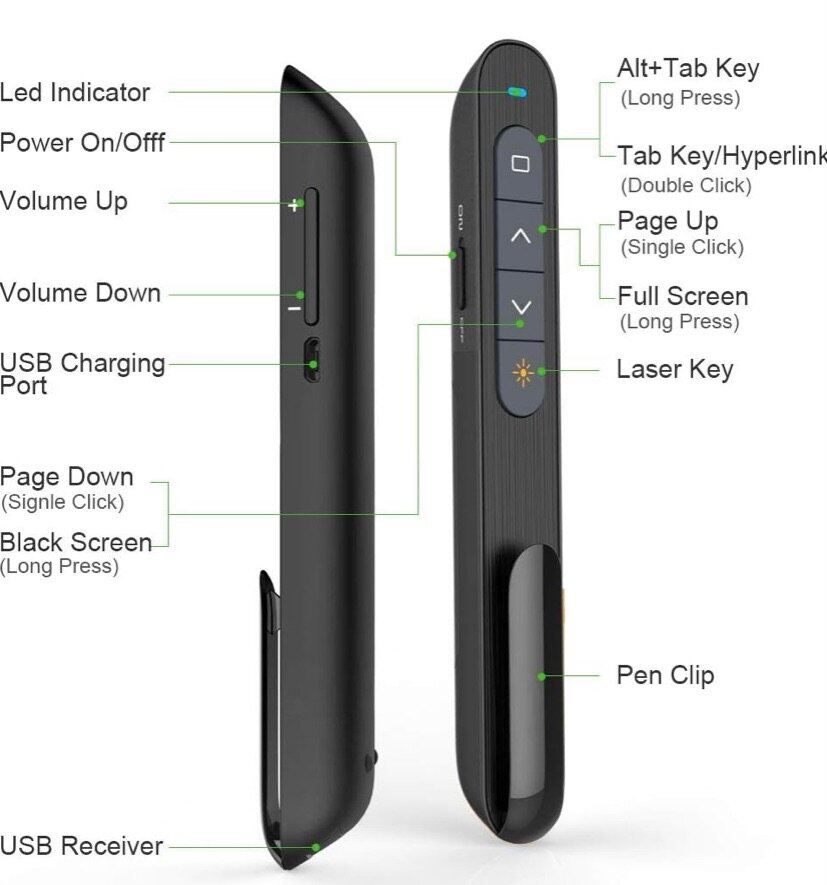 Plage de contrôle longue de 300 pieds & feu vert vifMeilleur choix pour les présentations à grande échelle, plage de clicage sans fil: 328 pieds, distance laser: 656 pieds. Le laser vert nest pas seulement six fois plus puissant que le laser rouge, il attire plus facilement lattention de votre public.