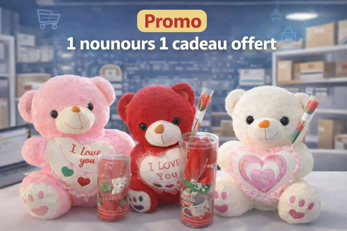 Offrez un nounours en peluche accompagné d'un contenant pour un cadeau personnel. Parfait pour la Saint-Valentin ou comme cadeau attentionné.